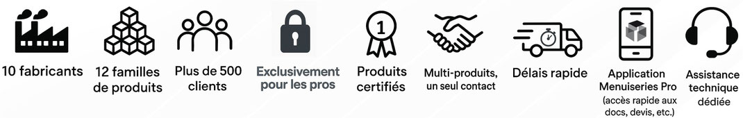 Fort de notre expérience et de notre analyse, nous sélectionnons avec minutie pour nos clients professionnels des fabricants dont nous avons la représentation exclusive de leurs gammes de produits : menuiseries PVC, bois, aluminuim, volets roulants, volets battants, stores, pergolas, portes de garage, portes blindées, portails, clôtures, gardes corps, brise-soleil orientables, moustiquaires…
